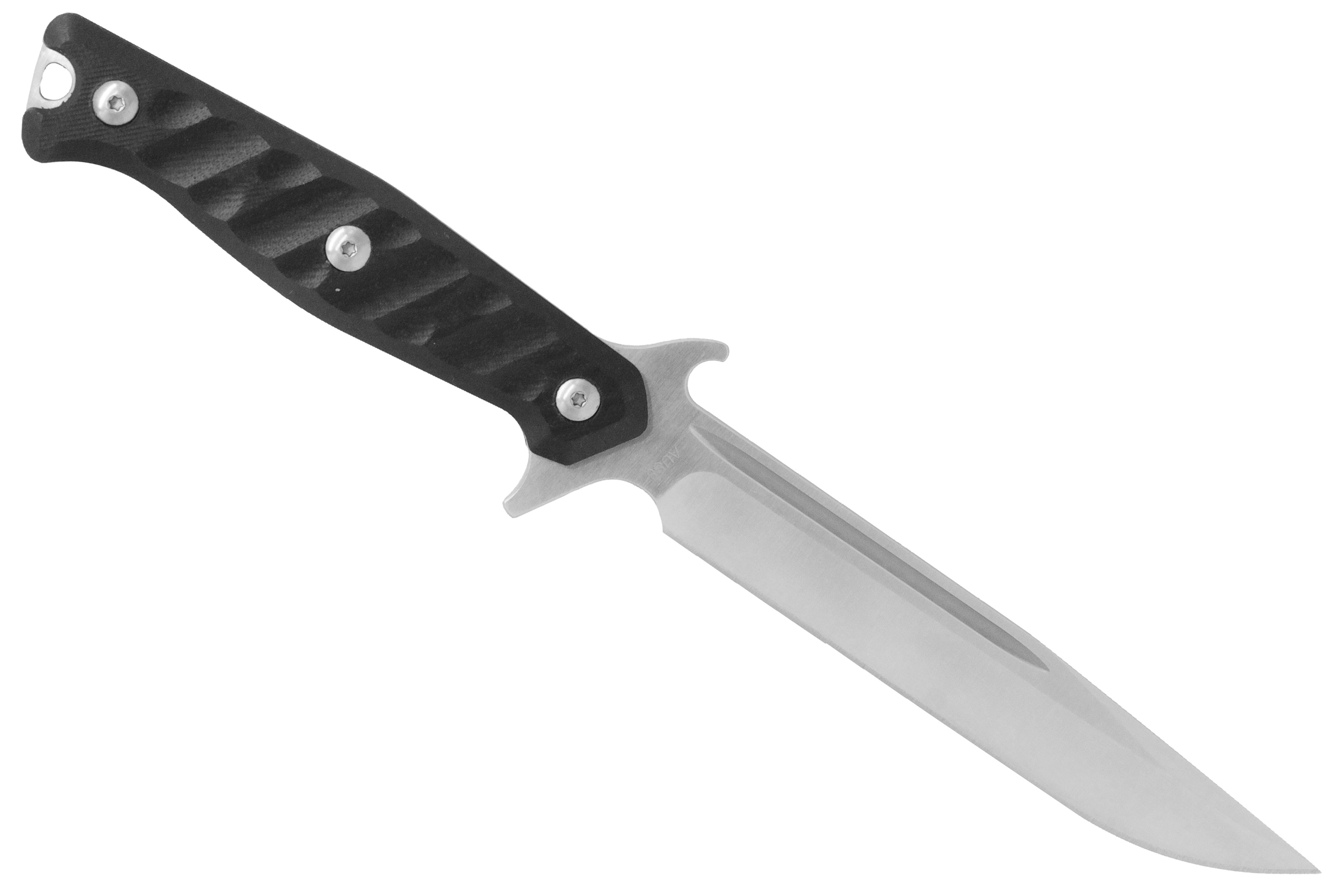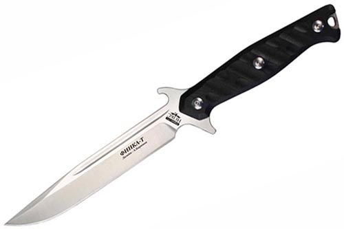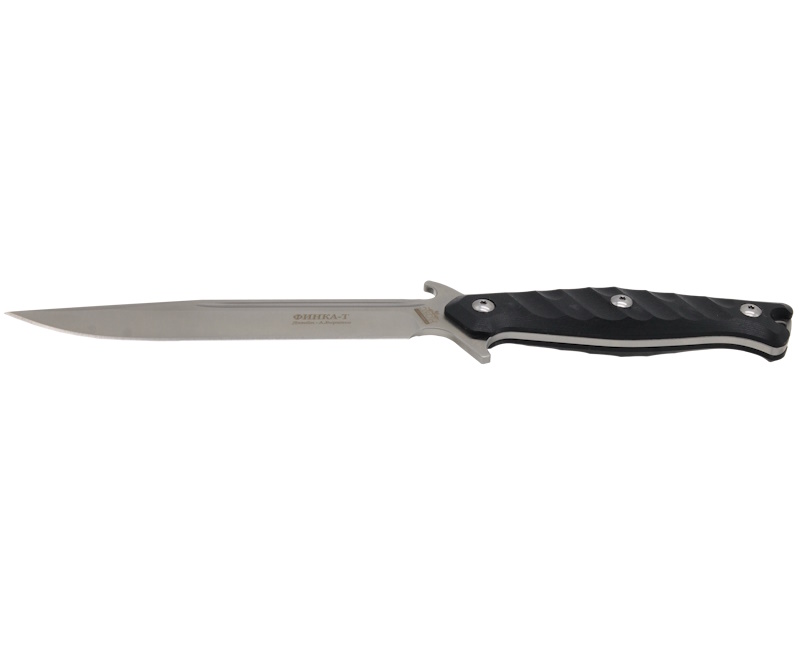 Про туристический нож Финка-Т можно сказать, что это современная и глубоко переосмысленная версия легендарной вачинской финки, она же – финка НКВД. Но в тоже время это совершенно оригинальный нож. «Т» в названии модели означает – «техно», то есть совершенно иную стилистику и конструктивные решения. Нож имеет цельнометаллическую конструкция с рукояткой по типу «фуллтанг». Её хвостовик доходит до конца рукояти, полностью повторяя ее контур - это гарантирует ей максимальную надежность. Накладки на рукоять выполнены из G-10 - неубиваемого материала, уже ставшего настоящей легендой. Он не боится ни влаги, ни выцветания, ни ударных нагрузок. Сами накладки имеют переменную толщину и трёхмерный рельеф, предотвращающий выскальзывание из руки. На конце рукояти предусмотрено специальное отверстие под темляк. Неширокий клинок из нержавеющей японской ножевой стали AUS8 с острием типа «клип-пойнт», ("щучкой") и узким двусторонним долом имеет прочную и острую заточку. Спуски на клинке прямые, с двух третей ширины, что даёт и необходимую для хорошего реза геометрию и высокую прочность самого клинка.