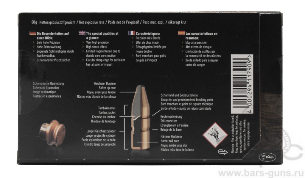 Сердце пули Doppelkern состоит из двух свинцовых сердечников, каждый из которых выполняет свою уникальную функцию. Передний, более мягкий сердечник, предназначен для надежной фрагментации при попадании, обеспечивая мощный удар и мгновенное поражение цели. Задний, более твердый сердечник, защищен уникальным металлическим колпачком, который контролирует деформацию пули и обеспечивает её стабильное проникновение.