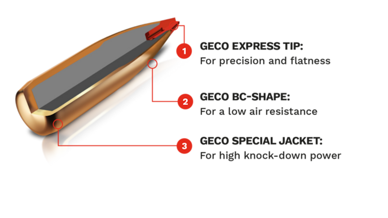 Фирменная оболочка GECO гарантирует непревзойденную ударопрочность, позволяя пуле преодолевать любые преграды на пути к добыче.