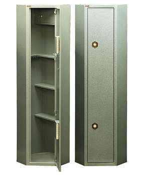 Шкаф предназначен для хранения 3 ружей высотой до 1450 мм. Оснащен двумя усиленными замками ПРО-САМ. Шкаф предназначен для установки в углу. Имеется внутренний ящик (трейзер) с отдельным замком. В данном угловом оружейном шкафе сделаны 3 несъемных полки для принадлежностей. Ширина и глубина указаны по боковым стенкам, которые соприкасаются со стенами помещения.