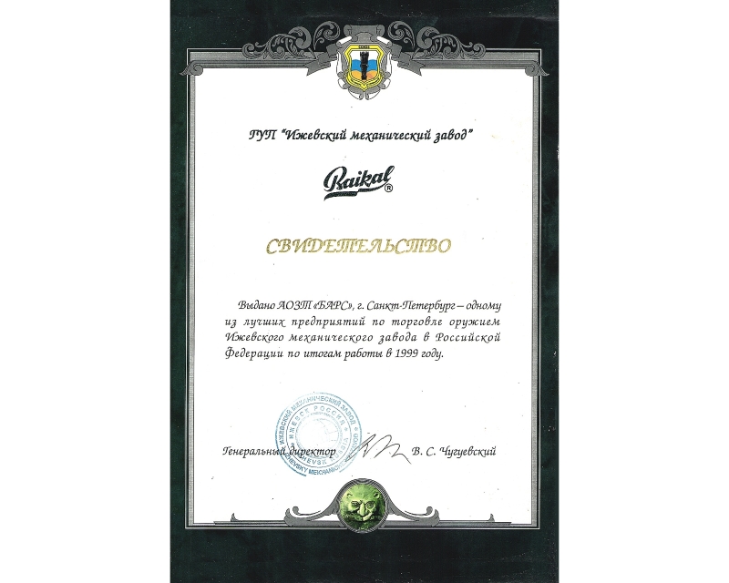 Постоянные покупатели оружейного магазина «Барс», пользующиеся услугами оптового отдела, скорее всего, почти не замечают висящее на стене "Свидетельство", выданное от имени Ижевского механического завода. А ведь этот документ реальное отражение многолетней специализации «Барса» по продажах ижевского оружия. Только в оружейном магазине «Барс» можно найти в продаже весь ассортимент гражданского, служебного и спортивного оружия, выпускаемого Ижевским механическим заводом. Конец 1990-х годов был периодом доминирования ижевского оружия в продажах в России и активного освоения зарубежных рынков. Бурно развивался модельный ряд охотничьих ружей. Эжекторные и односпусковые, с дульными насадками и курковые - все это изобилие находило покупателей в больших количествах. Сейчас ассортимент, увы, уже не тот, но репутация надежного и рабочего ижевского охотничьего оружия пока еще непоколебима. Скорее всего, почти каждый владелец оружия на Северо-Западе имеет в своей биографии опыт владения изделиями Ижевского механического завода. И многие из них купили его именно в «Барсе» и мы вместе были участниками истории, которая нашла отражения в "Свидетельстве 1999 года".